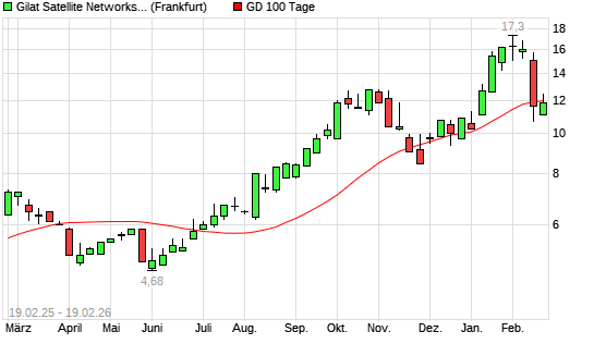 Mit dem Anstieg auf 12,50 EUR hat die GILAT SATELLITE NETWORKS-Aktie am 18.02.2026 die 100-Tage-Linie nach oben gekreuzt.Der Abstand zur 200-Tage-Linie beträgt aktuell +31,38%. ...weiterlesen