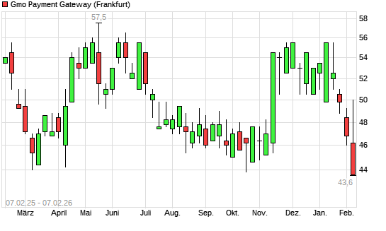 Mit dem Rücksetzer auf 43,60 EUR hat die GMO Payment Gateway-Aktie (ISIN JP3385890003) am 06.02.2026 ein neues 12-Monats-Tief erreicht und damit den Kurs vom 09.04.2025 eingestellt.Die ...weiterlesen