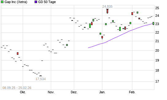 Mit dem Rücksetzer auf 22,79 EUR hat die Gap-Aktie am 24.02.2026 die 50-Tage-Linie nach unten gekreuzt.Die Gap-Aktie befindet sich seit dem 24.10.2025 im langfristigen ...weiterlesen