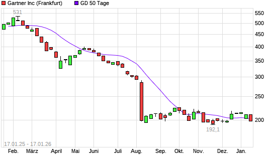 Mit dem Rücksetzer auf 197,80 EUR hat die Gartner-Aktie am 16.01.2026 die 50-Tage-Linie nach unten gekreuzt.Die Gartner-Aktie befindet sich seit dem 05.03.2025 im langfristigen Abwärtstrend ...weiterlesen