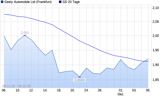 Mit dem Anstieg auf 1,92 EUR hat die Geely Automobile-Aktie am 05.12.2025 die 20-Tage-Linie nach oben gekreuzt.Die Geely Automobile-Aktie befindet sich seit dem 03.11.2025 im langfristigen Abwärtstrend ...weiterlesen