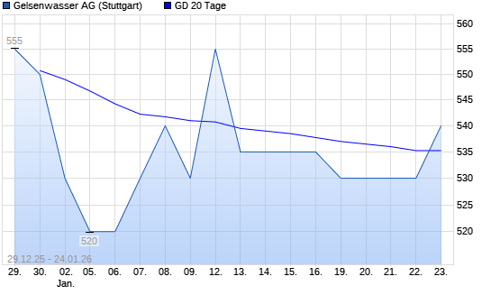 Mit dem Anstieg auf 540,00 EUR hat die Gelsenwasser-Aktie am 23.01.2026 die 20-Tage-Linie nach oben gekreuzt.Die Gelsenwasser-Aktie befindet sich seit dem 09.01.2026 im ...weiterlesen