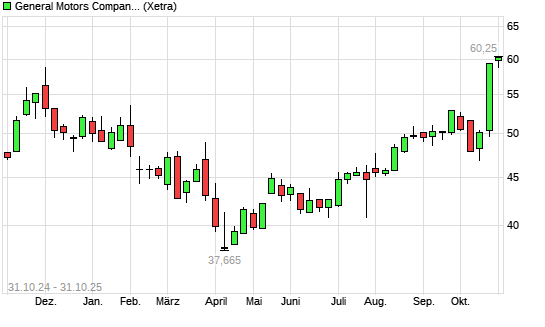 Mit dem Anstieg auf 60,16 EUR hat die General Motors-Aktie (ISIN US37045V1008) am 30.10.2025 ein neues All-Time-High erreicht und damit den Kurs vom 29.10.2025 eingestellt.Die General Motors-Aktie ...weiterlesen