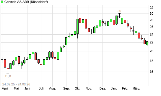 Mit dem Rücksetzer auf 22,00 EUR hat die Genmab A/S-Aktie (ISIN US3723032062) am 23.03.2026 ein neues 6-Monats-Tief erreicht und damit den Kurs vom 19.03.2026 eingestellt.Die ...weiterlesen
