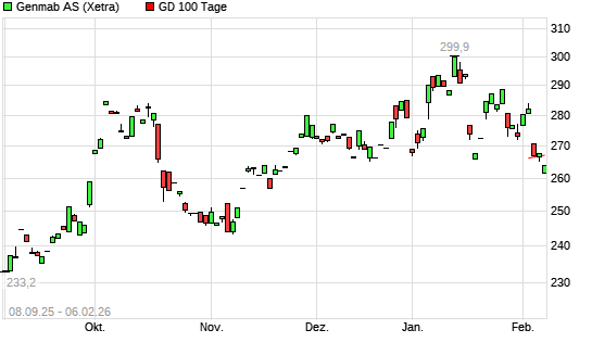Mit dem Rücksetzer auf 259,40 EUR hat die Genmab-Aktie am 05.02.2026 die 100-Tage-Linie nach unten gekreuzt.Die Genmab-Aktie befindet sich seit dem 13.08.2025 im langfristigen Aufwärtstrend ...weiterlesen
