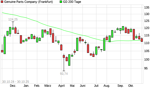 Mit dem Rücksetzer auf 111,10 EUR hat die Genuine Parts Company-Aktie am 29.10.2025 die 200-Tage-Linie nach unten gekreuzt.Die Genuine Parts Company-Aktie befand sich seit dem 23.07.2025 ...weiterlesen