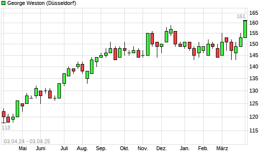 Mit dem Anstieg auf 160,00 EUR hat die George Weston-Aktie (ISIN CA9611485090) am 02.04.2025 ein neues All-Time-High erreicht und damit den Kurs vom 13.12.2024 eingestellt.Die ...weiterlesen