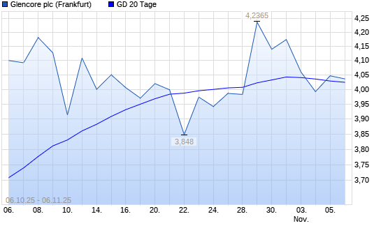 Mit dem Anstieg auf 4,05 EUR hat die Glencore-Aktie am 05.11.2025 die 20-Tage-Linie nach oben gekreuzt.Die Glencore-Aktie befindet sich seit dem 22.09.2025 im langfristigen Aufwärtstrend und ...weiterlesen