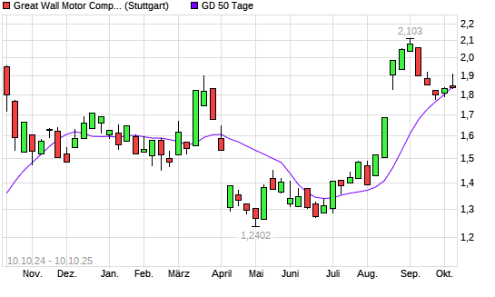 Mit dem Rücksetzer auf 1,84 EUR hat die Great Wall Motor Company-Aktie am 09.10.2025 die 50-Tage-Linie nach unten gekreuzt.Die Great Wall Motor Company-Aktie befindet sich seit dem 08.08.2025 ...weiterlesen