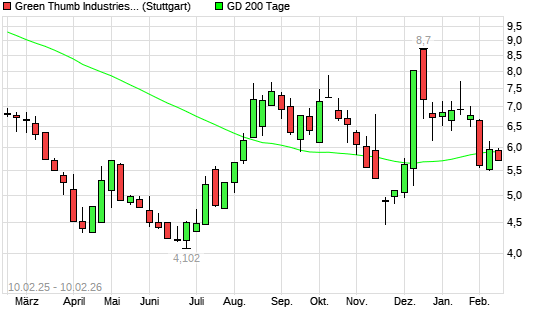 Mit dem Rücksetzer auf 5,75 EUR hat die Green Thumb Industries-Aktie am 09.02.2026 die 200-Tage-Linie nach unten gekreuzt.Die Green Thumb Industries-Aktie befand sich seit dem 06.02.2026 ...weiterlesen