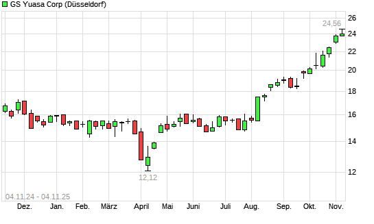 Mit dem Anstieg auf 24,20 EUR hat die Gs Yuasa-Aktie (ISIN JP3385820000) am 03.11.2025 ein neues 3-Jahres-Hoch erreicht und damit den Kurs vom 31.10.2025 eingestellt.Die Gs Yuasa-Aktie befindet ...weiterlesen