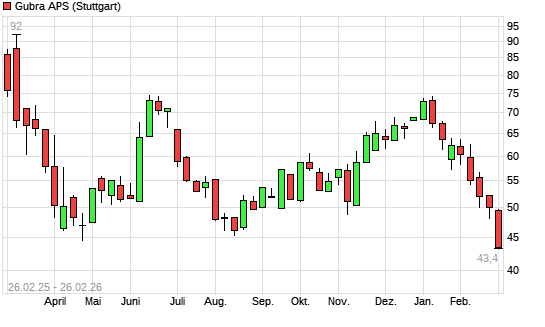 Mit dem Rücksetzer auf 43,96 EUR hat die Gubra-Aktie (ISIN DK0062266474) am 25.02.2026 ein neues 12-Monats-Tief erreicht und damit den Kurs vom 24.02.2026 eingestellt.Die ...weiterlesen
