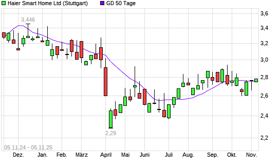 Mit dem Anstieg auf 2,78 EUR hat die HAIER SMART HOME H-Aktie am 04.11.2025 die 50-Tage-Linie nach oben gekreuzt.Die HAIER SMART HOME H-Aktie befindet sich seit dem 31.10.2025 im langfristigen ...weiterlesen