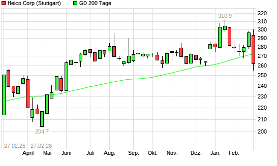 Mit dem Rücksetzer auf 261,00 EUR hat die HEICO-Aktie am 26.02.2026 die 200-Tage-Linie nach unten gekreuzt.Die HEICO-Aktie befand sich seit dem 13.02.2026 im ...weiterlesen