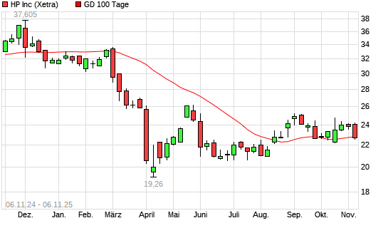 Mit dem Rücksetzer auf 22,57 EUR hat die HP-Aktie am 05.11.2025 die 100-Tage-Linie nach unten gekreuzt.Die HP-Aktie befindet sich seit dem 26.02.2025 im langfristigen Abwärtstrend ...weiterlesen