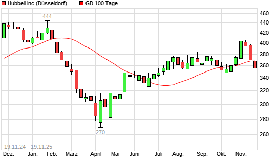Mit dem Rücksetzer auf 358,00 EUR hat die HUBBELL-Aktie am 18.11.2025 die 100-Tage-Linie nach unten gekreuzt.Die HUBBELL-Aktie befindet sich seit dem 09.10.2025 im langfristigen Aufwärtstrend ...weiterlesen