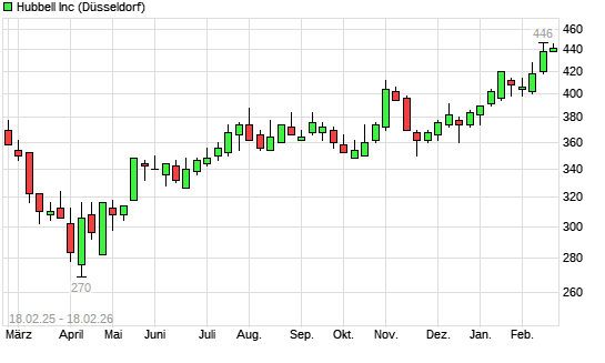 Mit dem Anstieg auf 448,00 EUR hat die HUBBELL-Aktie (ISIN US4435106079) am 17.02.2026 ein neues All-Time-High erreicht und damit den Kurs vom 22.11.2024 eingestellt.Die ...weiterlesen