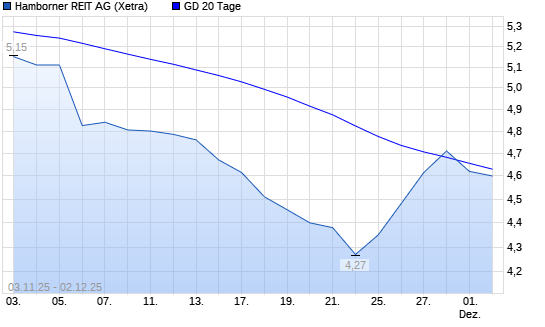 Mit dem Rücksetzer auf 4,62 EUR hat die Hamborner REIT-Aktie am 01.12.2025 die 20-Tage-Linie nach unten gekreuzt.Die Hamborner REIT-Aktie befindet sich seit dem 27.06.2025 im langfristigen ...weiterlesen