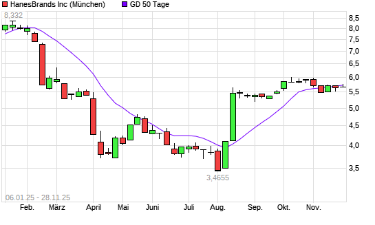 Mit dem Anstieg auf 5,66 EUR hat die Hanesbrands-Aktie am 05.01.2026 die 50-Tage-Linie nach oben gekreuzt.Die Hanesbrands-Aktie befindet sich seit dem 22.09.2025 im langfristigen Aufwärtstrend ...weiterlesen