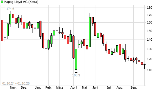 Mit dem Rücksetzer auf 112,60 EUR hat die Hapag-Lloyd-Aktie (ISIN DE000HLAG475) am 30.09.2025 ein neues 12-Monats-Tief erreicht und damit den Kurs vom 29.09.2025 eingestellt.Die Hapag-Lloyd-Aktie ...weiterlesen