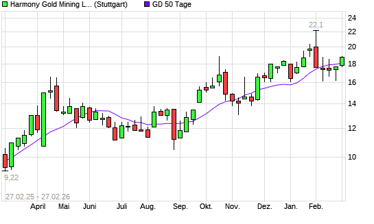 Mit dem Anstieg auf 18,80 EUR hat die Harmony Gold Mining-Aktie am 26.02.2026 die 50-Tage-Linie nach oben gekreuzt.Die Harmony Gold Mining-Aktie befindet sich seit dem 01.09.2025 ...weiterlesen