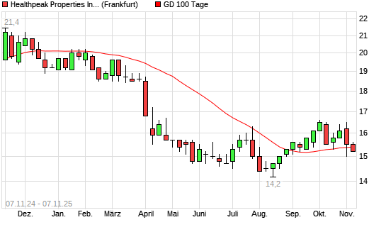 Mit dem Rücksetzer auf 15,20 EUR hat die Healthpeak Properties-Aktie am 06.11.2025 die 100-Tage-Linie nach unten gekreuzt.Die Healthpeak Properties-Aktie befindet sich seit dem 03.03.2025 ...weiterlesen