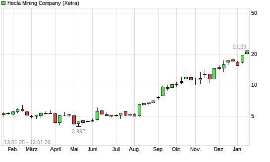 Mit dem Anstieg auf 21,00 EUR hat die Hecla Mining-Aktie (ISIN US4227041062) am 12.01.2026 ein neues All-Time-High erreicht und damit den Kurs vom 09.01.2026 eingestellt.Die Hecla Mining-Aktie ...weiterlesen