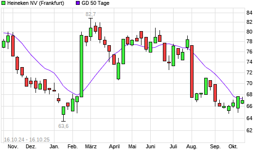 Mit dem Rücksetzer auf 67,04 EUR hat die Heineken-Aktie am 15.10.2025 die 50-Tage-Linie nach unten gekreuzt.Die Heineken-Aktie befindet sich seit dem 28.07.2025 im langfristigen Abwärtstrend ...weiterlesen
