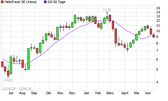 Mit dem Rücksetzer auf 9,25 EUR hat die HelloFresh-Aktie am 12.06.2025 die 50-Tage-Linie nach unten gekreuzt.Die HelloFresh-Aktie befindet sich seit dem 04.06.2025 im langfristigen Abwärtstrend ...weiterlesen