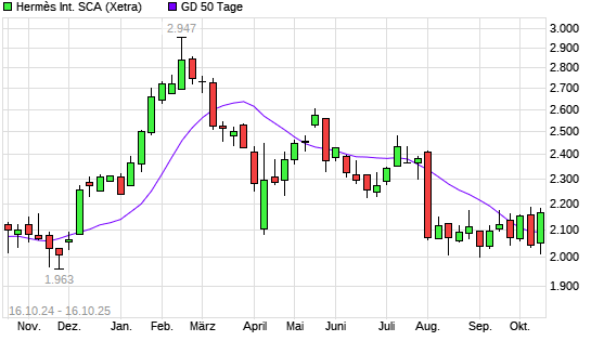 Mit dem Anstieg auf 2.170,00 EUR hat die Hermès-Aktie am 15.10.2025 die 50-Tage-Linie nach oben gekreuzt.Die Hermès-Aktie befindet sich seit dem 30.07.2025 im langfristigen Abwärtstrend ...weiterlesen