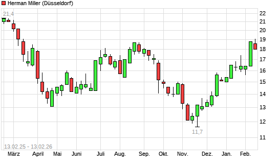 Mit dem Anstieg auf 18,90 EUR hat die Herman Miller-Aktie (ISIN US6005441000) am 12.02.2026 ein neues 6-Monats-Hoch erreicht und damit den Kurs vom 11.02.2026 eingestellt.Die Herman Miller-Aktie ...weiterlesen
