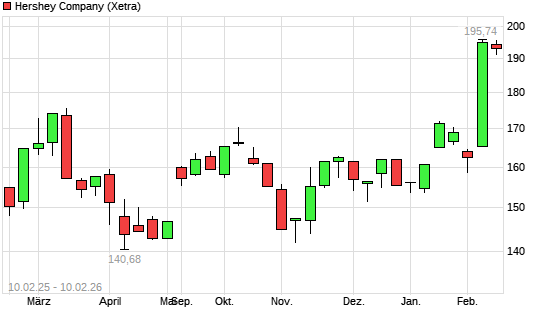 Mit dem Anstieg auf 194,96 EUR hat die Hershey Company-Aktie (ISIN US4278661081) am 09.02.2026 ein neues 12-Monats-Hoch erreicht und damit den Kurs vom 06.02.2026 eingestellt.Die ...weiterlesen