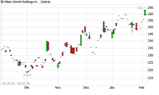 Mit dem Anstieg auf 260,30 EUR hat die Hilton-Aktie (ISIN US43300A2033) am 05.02.2026 ein neues 6-Monats-Hoch erreicht und damit den Kurs vom 16.01.2026 eingestellt.Die Hilton-Aktie befindet ...weiterlesen