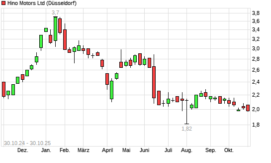 Mit dem Rücksetzer auf 1,98 EUR hat die Hino Motors-Aktie (ISIN JP3792600003) am 29.10.2025 ein neues 10-Jahres-Tief erreicht und damit den Kurs vom 17.10.2025 eingestellt.Die Hino Motors-Aktie ...weiterlesen