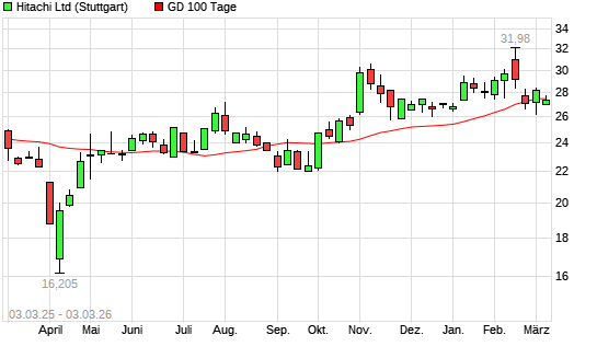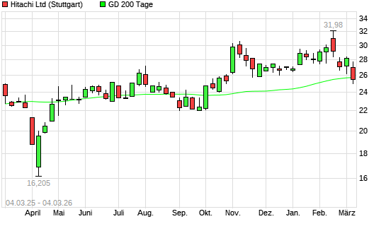 Mit dem Rücksetzer auf 25,13 EUR hat die Hitachi-Aktie am 03.03.2026 die 200-Tage-Linie nach unten gekreuzt.Die Hitachi-Aktie befand sich seit dem 03.10.2025 im ...weiterlesen