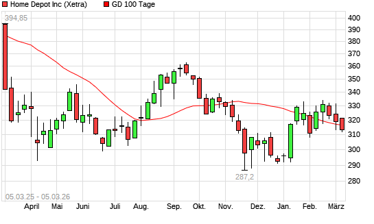 Mit dem Rücksetzer auf 311,40 EUR hat die Home Depot-Aktie am 04.03.2026 die 100-Tage-Linie nach unten gekreuzt.Die Home Depot-Aktie befindet sich seit dem 25.02.2026 im ...weiterlesen