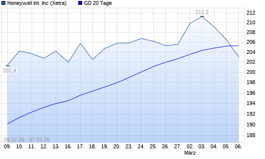 Mit dem Rücksetzer auf 200,20 EUR hat die Honeywell-Aktie am 06.03.2026 die 20-Tage-Linie nach unten gekreuzt.Die Honeywell-Aktie befindet sich seit dem 09.01.2026 im ...weiterlesen