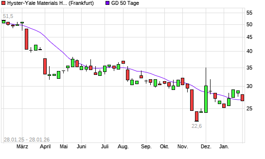Mit dem Rücksetzer auf 26,80 EUR hat die Hyster-Yale Materials Handling-Aktie am 27.01.2026 die 50-Tage-Linie nach unten gekreuzt.Die Hyster-Yale Materials Handling-Aktie befindet sich ...weiterlesen