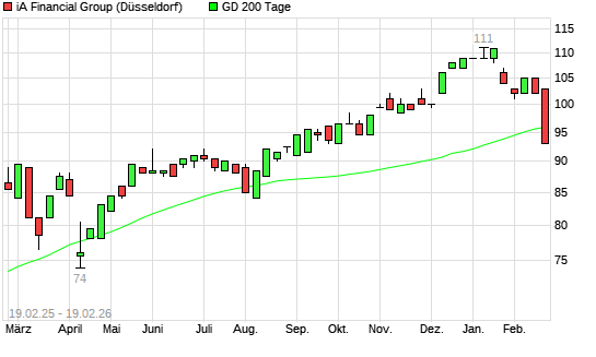 Mit dem Rücksetzer auf 95,50 EUR hat die IA Financial-Aktie am 18.02.2026 die 200-Tage-Linie nach unten gekreuzt.Die IA Financial-Aktie befand sich seit dem 07.08.2025 ...weiterlesen