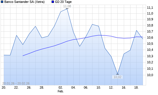 Mit dem Rücksetzer auf 10,54 EUR hat die Banco Santander-Aktie am 19.02.2026 die 20-Tage-Linie nach unten gekreuzt.Die Banco Santander-Aktie befindet sich seit dem 07.01.2025 ...weiterlesen