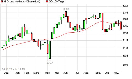 Mit dem Rücksetzer auf 12,58 EUR hat die IG GROUP HOLDINGS-Aktie am 13.11.2025 die 100-Tage-Linie nach unten gekreuzt.Die IG GROUP HOLDINGS-Aktie befindet sich seit dem 23.10.2025 im langfristigen ...weiterlesen