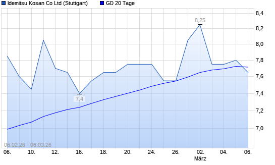 Mit dem Anstieg auf 8,05 EUR hat die Idemitsu Kosan-Aktie am 05.03.2026 die 20-Tage-Linie nach oben gekreuzt.Die Idemitsu Kosan-Aktie befindet sich seit dem 22.10.2025 im ...weiterlesen