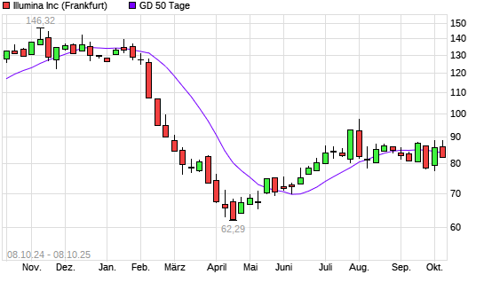 Mit dem Rücksetzer auf 82,67 EUR hat die Illumina-Aktie am 07.10.2025 die 50-Tage-Linie nach unten gekreuzt.Die Illumina-Aktie befindet sich seit dem 07.02.2025 im langfristigen Abwärtstrend ...weiterlesen