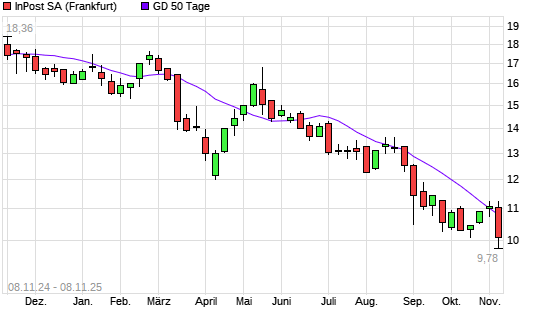 Mit dem Rücksetzer auf 10,09 EUR hat die InPost-Aktie am 07.11.2025 die 50-Tage-Linie nach unten gekreuzt.Die InPost-Aktie befindet sich seit dem 28.02.2025 im langfristigen Abwärtstrend ...weiterlesen