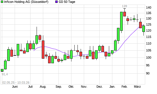 Mit dem Rücksetzer auf 119,00 EUR hat die Inficon Holding AG-Aktie am 09.03.2026 die 50-Tage-Linie nach unten gekreuzt.Die Inficon Holding AG-Aktie befindet sich seit dem ...weiterlesen