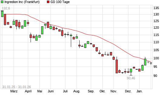 Mit dem Anstieg auf 97,30 EUR hat die Ingredion-Aktie am 30.01.2026 die 100-Tage-Linie nach oben gekreuzt.Die Ingredion-Aktie befindet sich seit dem 03.04.2025 im langfristigen Abwärtstrend ...weiterlesen