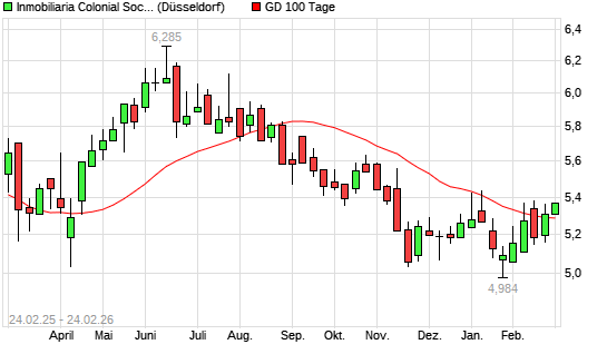 Mit dem Anstieg auf 5,31 EUR hat die Inmobiliaria Colonial-Aktie am 23.02.2026 die 100-Tage-Linie nach oben gekreuzt.Die Inmobiliaria Colonial-Aktie befindet sich seit dem 17.09.2025 ...weiterlesen