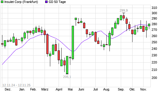 Mit dem Anstieg auf 281,00 EUR hat die Insulet Corp-Aktie am 11.11.2025 die 50-Tage-Linie nach oben gekreuzt.Die Insulet Corp-Aktie befindet sich seit dem 07.08.2025 im langfristigen Aufwärtstrend ...weiterlesen