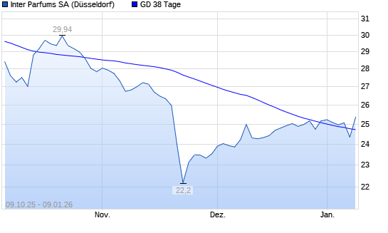 Mit dem Anstieg auf 25,00 EUR hat die Inter Parfums-Aktie am 09.01.2026 die 38-Tage-Linie nach oben gekreuzt.Die Inter Parfums-Aktie befindet sich seit dem 26.06.2025 im langfristigen Abwärtstrend ...weiterlesen