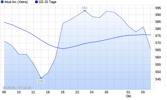 Mit dem Rücksetzer auf 569,40 EUR hat die Intuit-Aktie am 06.10.2025 die 20-Tage-Linie nach unten gekreuzt.Die Intuit-Aktie befindet sich seit dem 22.08.2025 im langfristigen Abwärtstrend ...weiterlesen